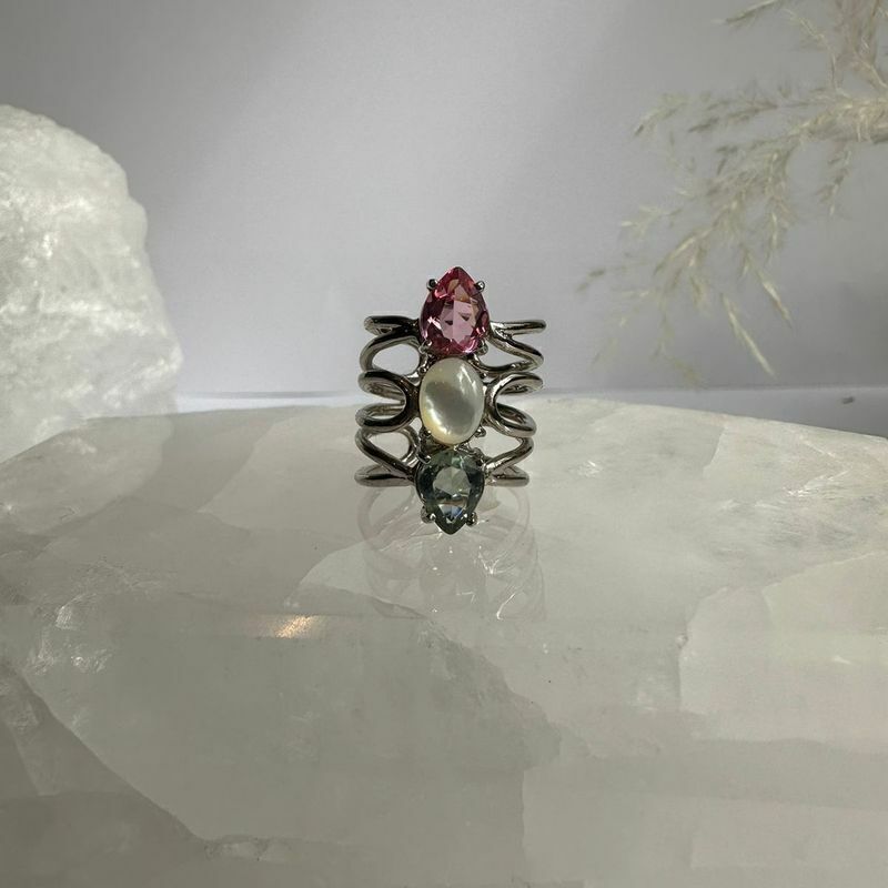 Anel Alegria em joia folheada, com banho de ouro amarelo 18k e cristais Ametista verde, Kunzita, Berilo, Ametista verde, Safira rosa, Madre perola