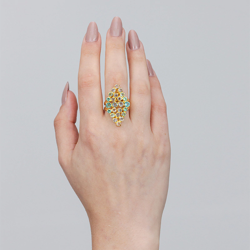 Anel Menés em joia folheada, com banho de ouro amarelo 18k e cristais Topázio sky, Paraíba, Água marinha, Ametista verde, Tanzanita, Safira rosa, Ametista rosa