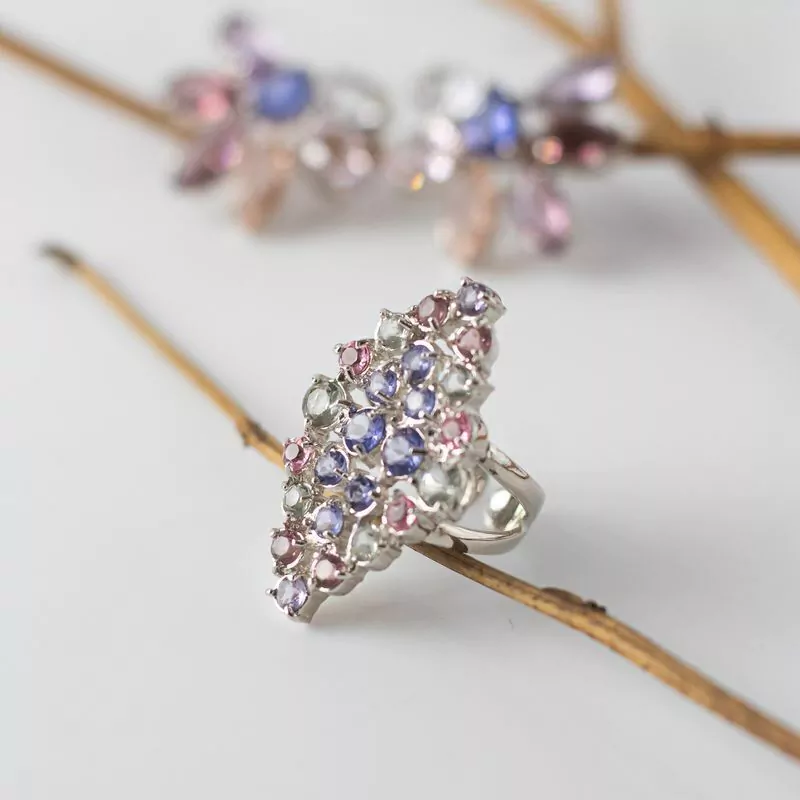 Anel Menés em joia folheada, com banho de ródio branco e cristais Topázio sky, Paraíba, Água marinha, Tanzanita, Safira rosa, Ametista rosa