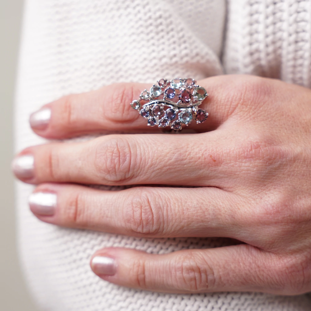 Anel Pacová joia folheada, com banho de rodio branco e cristais tanzanita,ametista verde,agua marinha e topazio london. Tamanho 3cm de comprimento x 2cm de largura. Anel Regulável. Esta peça folheada é feita à mão e com design próprio da Natália Chaim sob rigoroso processo de produção.