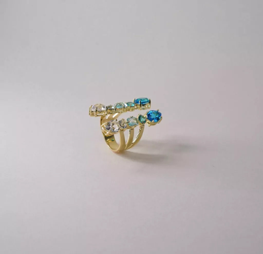 Anel Sócaris em joia folheada, com banho de ródio branco e cristais Topázio Sky, Berilo, Paraíba, Água Marinha, Morganita, Kunzita, Tanzanita