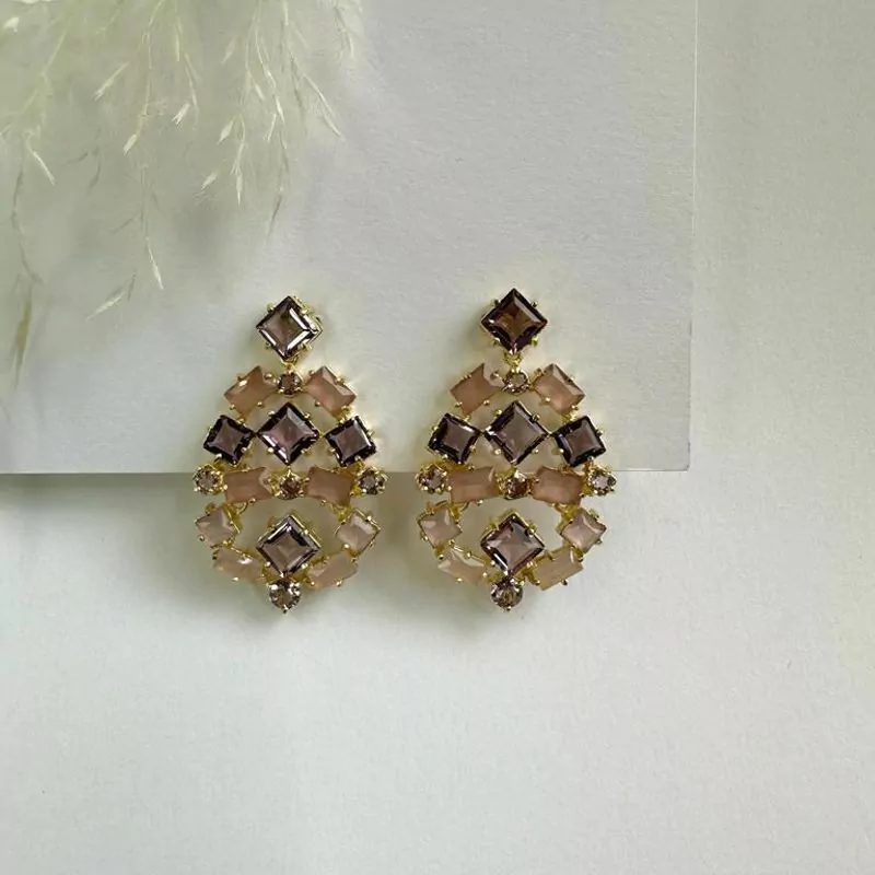 Brinco Base Antibes joia folheada, com banho de ouro amarelo 18k e cristais Ametista Rosa, Goiaba Fosca
