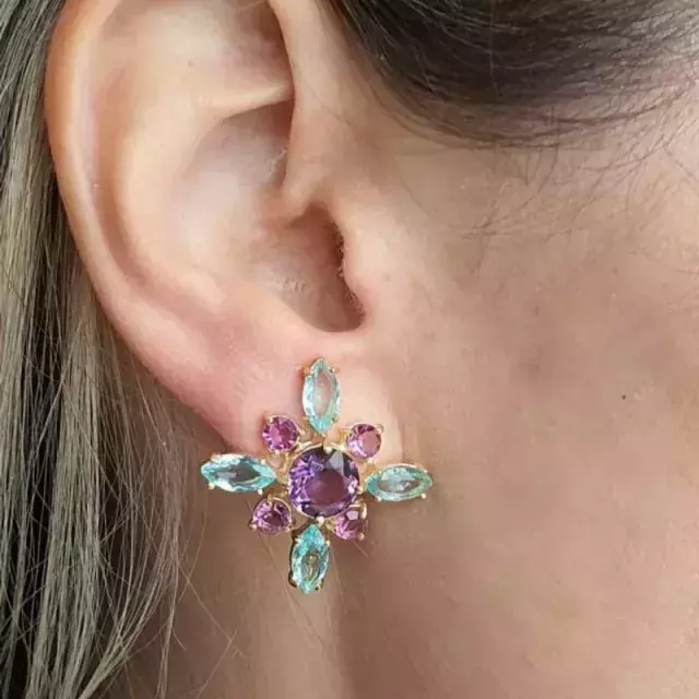 Brinco Cibele joia folheada, com banho de ouro amarelo 18k e cristais ametistarosa, topazio sky e ametista. Tamanho 2,7cm de comprimento x 2,7cm de largura. Esta peça folheada é feita à mão e com design próprio da Natália Chaim sob rigoroso processo de produção.