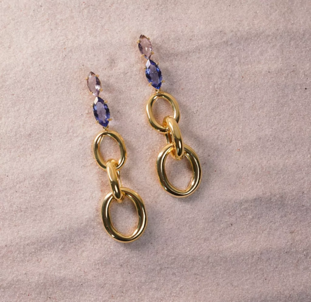 Brinco Guisa joia folheada, com banho de ouro amarelo 18k e cristais Tanzanita, Ametista, Topázio Imperial