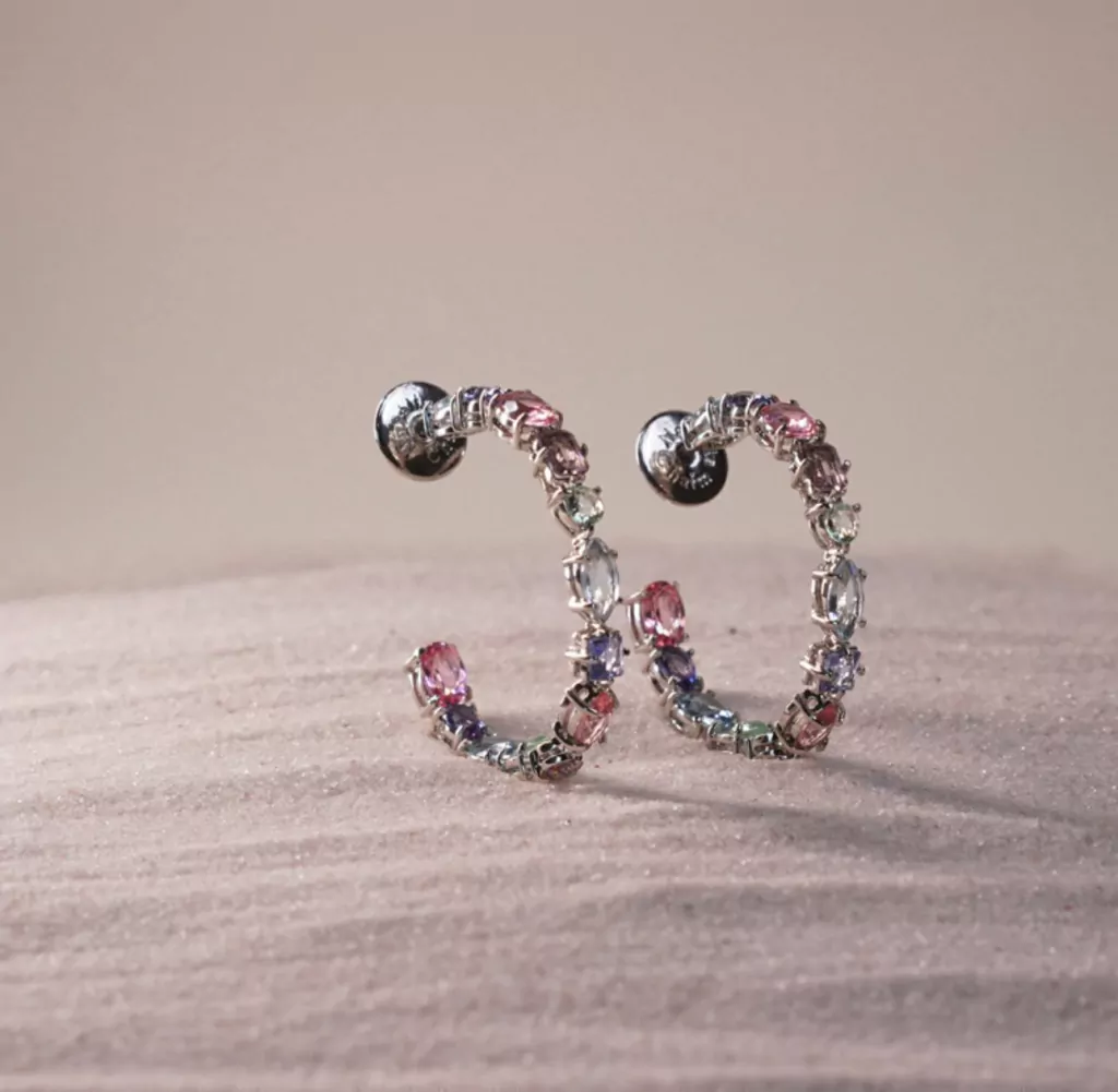 Brinco Sócaris joia folheada com banho de ródio branco e cristas Multicolor, Topázio Swiss, Água Marinha, Paraíba