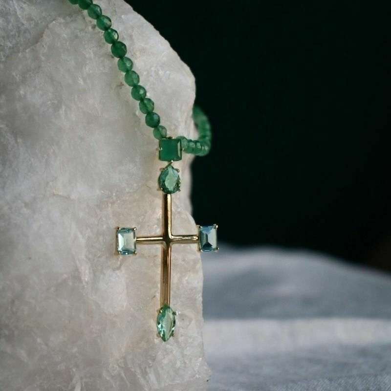 Colar Crucifixo em joia folheada, com banho de ouro amarelo 18k e cristais Berilo, Topázio sky, Jade verde com fio de pedras naturais